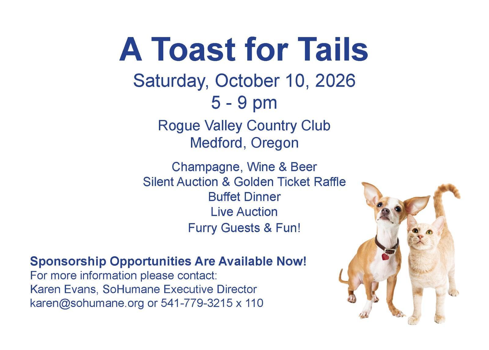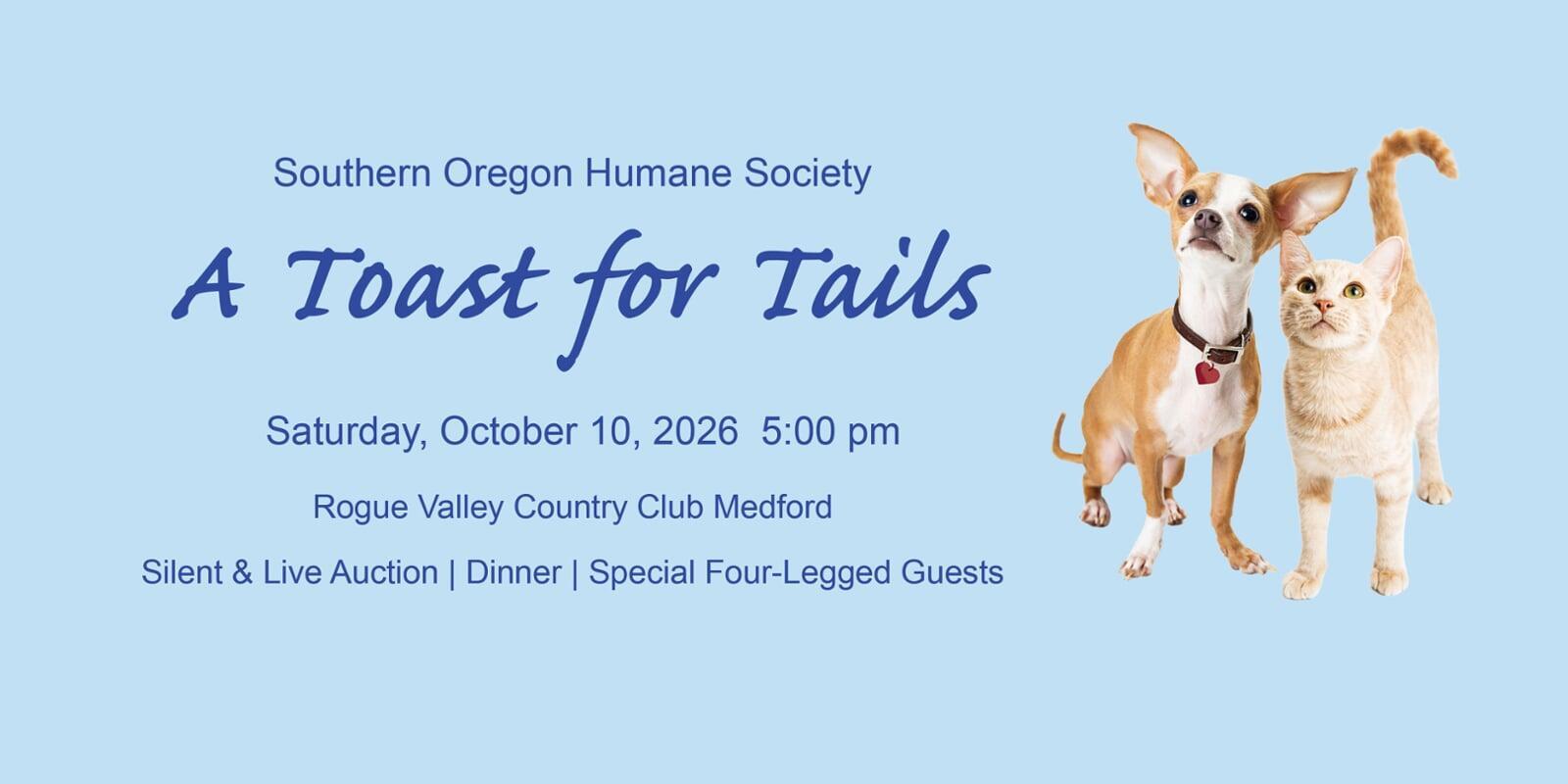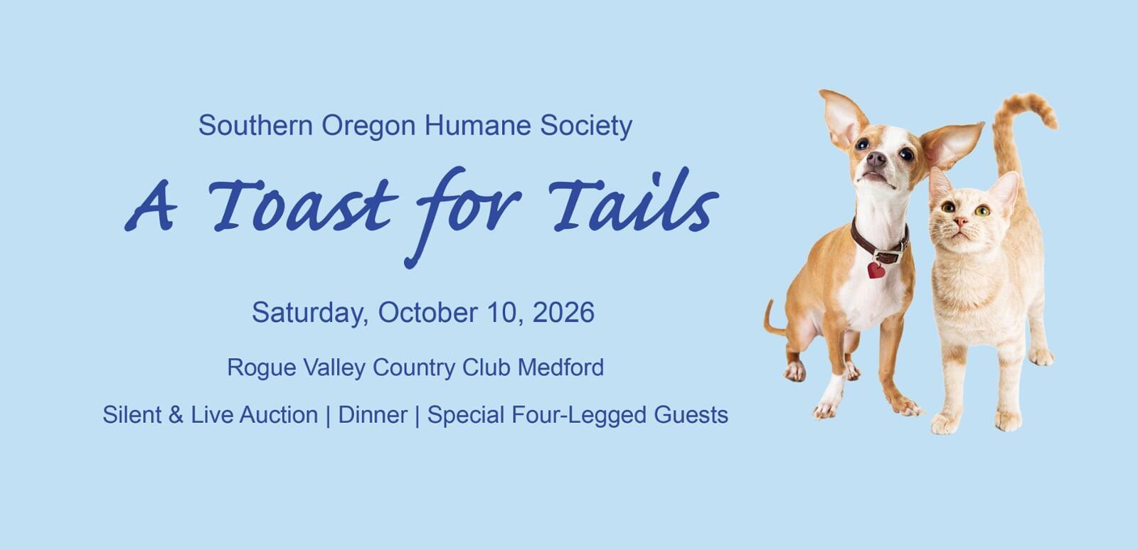 Save the date! October 10, 2026 marks the date for the Southern Oregon Humane Society’s 18th signature fundraising event, A Toast for Tails. SoHumane’s gala and auction is a celebration of our animal friends whose lives touch our hearts. Please join us in creating a brighter future for dogs and cats who are homeless by lending your support.